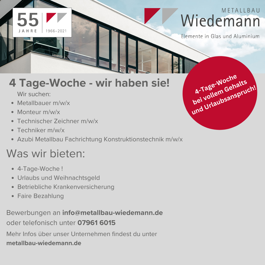Wir suchen: - Metallbauer m/w/x - Monteur m/w/x - Technischer Zeichner m/w/x - Techniker m/w/x - Azubi Metallbau Fachrichtung Konstruktionstechnik m/w/x Bewerbungen an info@metallbau-wiedemann.de oder telefonisch unter 07961 6015